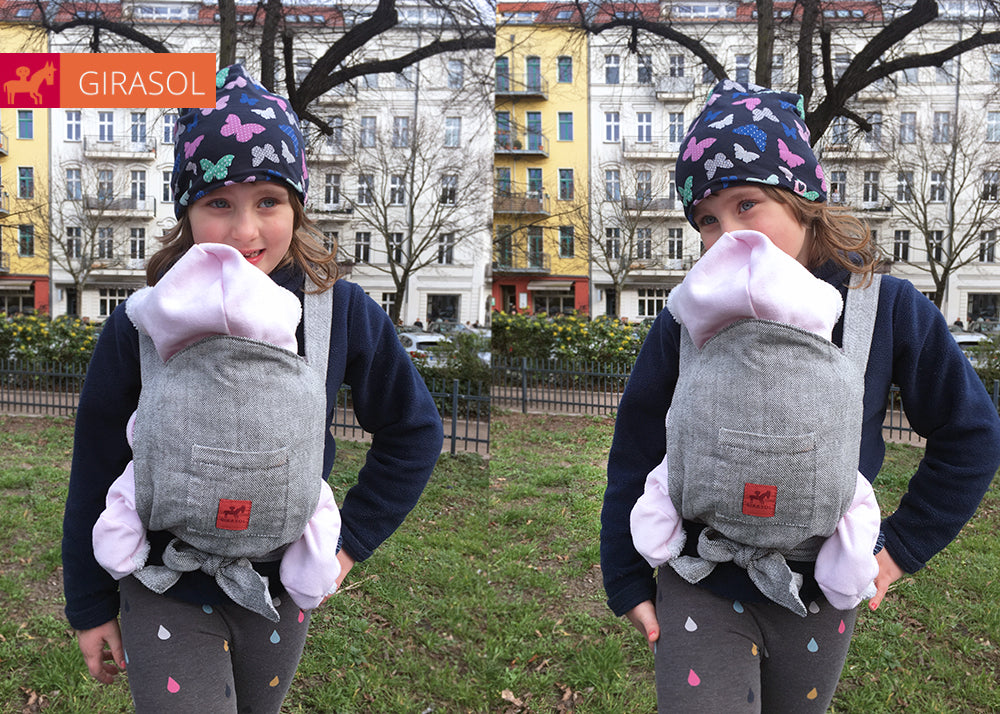 Für große Geschwister oder kleine Tragefans: Unsere Puppentragen sind eine liebevolle Einladung zum Mitmachen und Nachahmen. Aus Original-Tragetuchstoff gefertigt, genau wie bei den Großen.